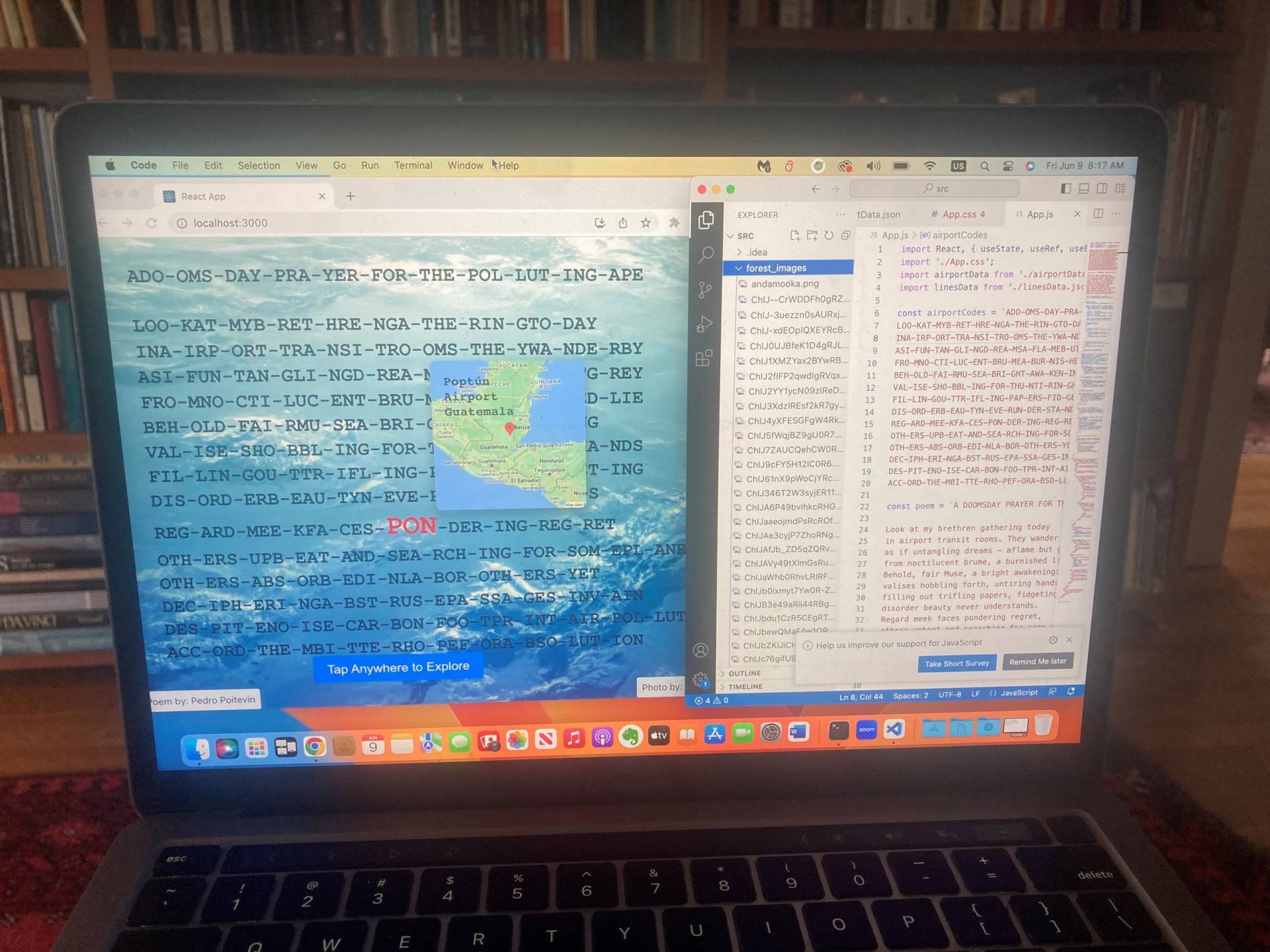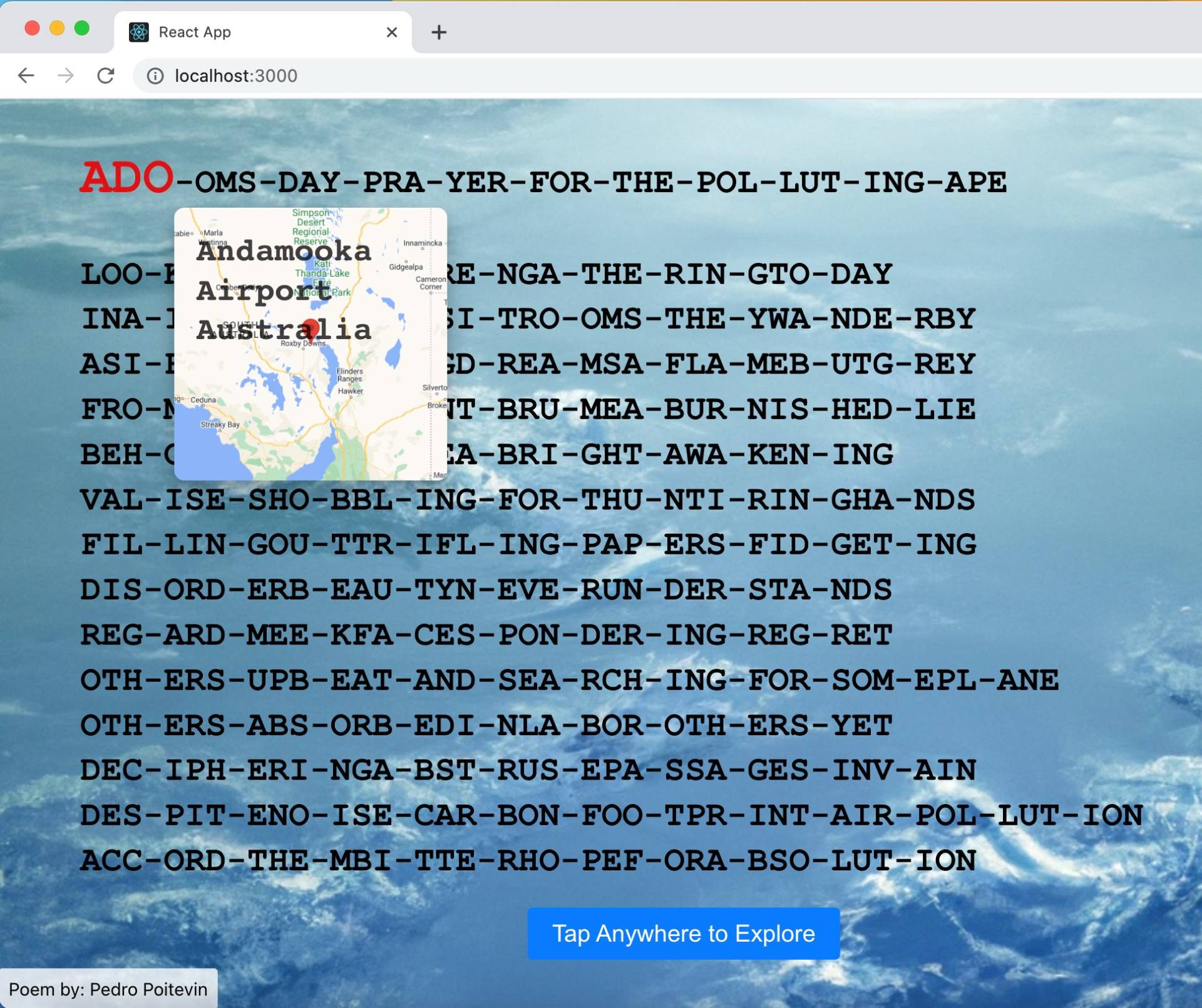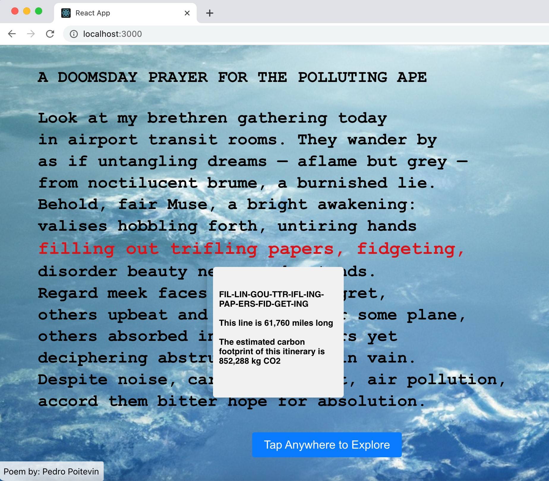 Though I am concerned about the labor market disruptions that may result from the rise of artificially intelligent language models, and even when they are woefully poor at the highly constrained writing I do, I have found them useful in writing code. For example, I recently wrote a sonnet by juxtaposing three-letter codes of airports. The title of the sonnet, “A Doomsday Prayer for the Polluting Ape,” illustrates this technique, as it is an itinerary of flights that begins in Andamooka, Australia (airport code ADO), and, after touching ground on the intermediate airports with codes OMS, DAY, PRA, YER, FOR, THE, POL, LUT, and ING, ends in San Juan Aposento, Perú (airport code APE). To make this poem come to life on the screen, I decided to develop an app that allows the reader to interact with the poem. An AI language model helped me streamline the development of this app.